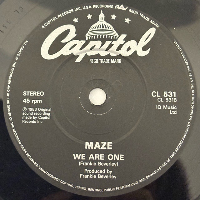シルシーヴォイスを持つ男性シンガーFrankie Beverly率いるグループMazeが81年にリリースしたニューオーリンズでのすばらしいライブの模様を収録した楽曲とスタジオテイクを収録した名盤「Live In New Orleans」からカットした7inch!