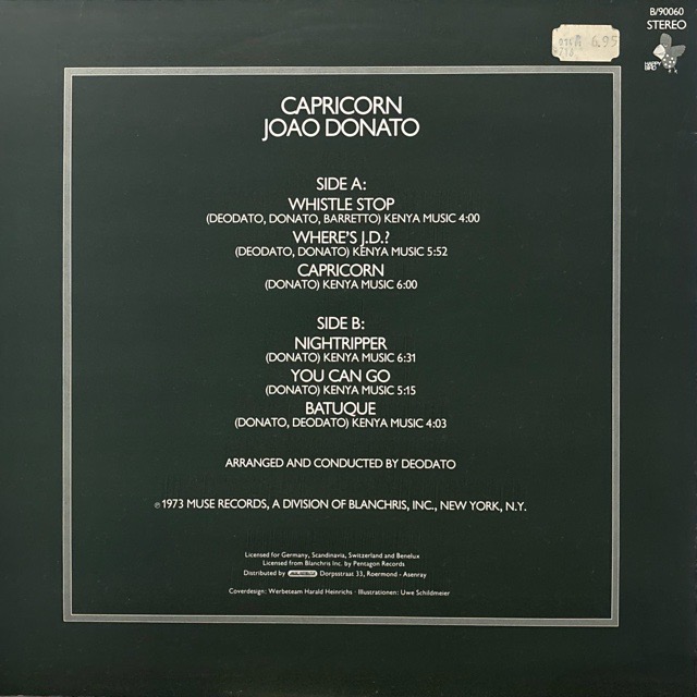 DeodatoのUSジャズ・アレンジが秀逸なブラジリアングルーヴB3「Batuque」、ワウギターを絡めたメロウB2「You Can Go」、流麗なフュージョンA3「Capricorn」、