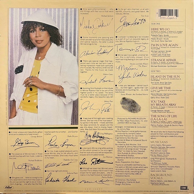 Patrice Rushen参加のB4「The Song Of Life(La-La-La)」、George Benson参加の陽だまり系ソウルB3「You Take My Breath Away」、ダンストラックA3「Strange Affair」など収録した素晴らしい1枚!ジャケット裏面には、沢山のアーティストから追悼のメッセージが寄せられています。