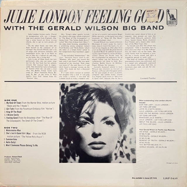 アメリカの女優/シンガーJulie LondonがGerald Wilson Bandを従えて65年に吹き込んだ名作。