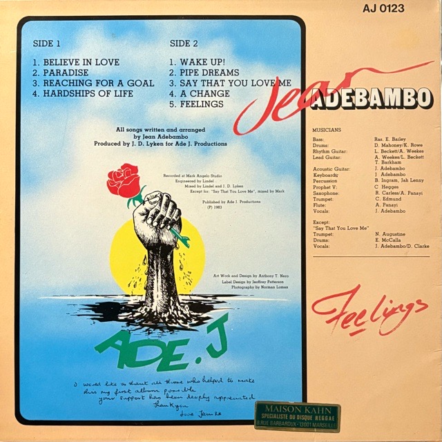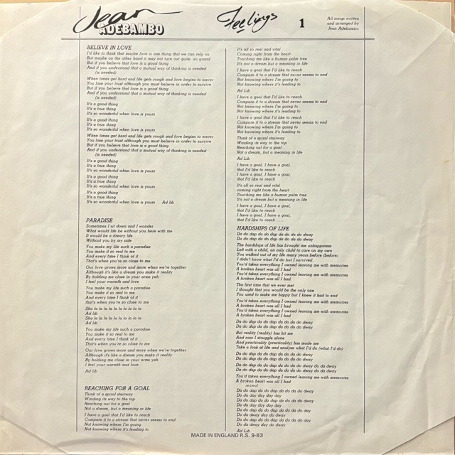 ボーカリストのみならず、ソングライター/鍵盤/ギターなども演奏するイギリスはロンドン出身の多才な女性アーティストJean Adebamboが83年に残した1stアルバム。