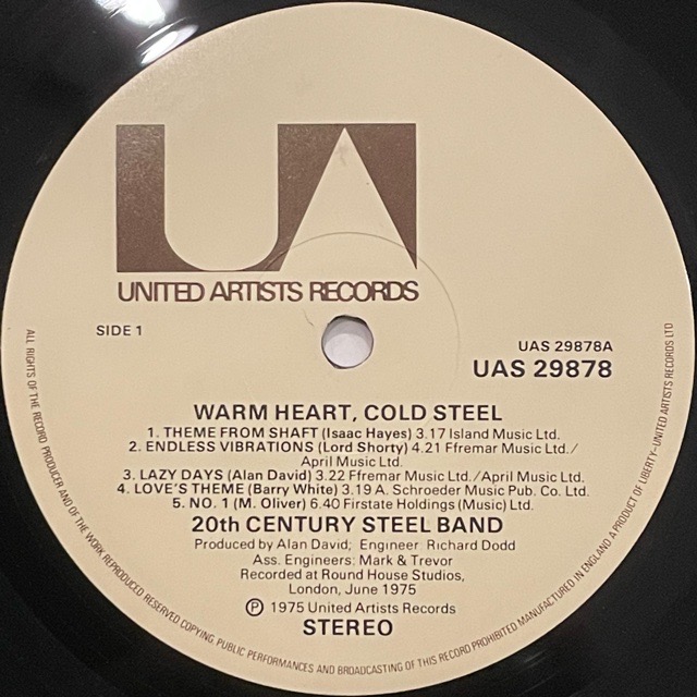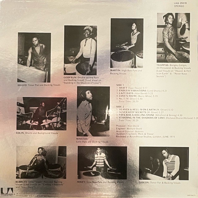 トリニダート出身、United Artists Recordsに2枚のアルバムを残す9人組、20th Century Steel Bandが75年にロンドンで録音した1stアルバム。「Ultimate Breaks & Beats」に収録されたJennifer Lopez「Jenny From the Block」のインパクト大の大ネタB1「Heaven and Hell」が、カリブ海〜レアグルーブファンクのクラシック!A1「Theme From Shaft」カバー、パーカッシブブレイクがあるA4「Endless Vibrations」、むせ返るほどに黒いB3「Papa Was A Rolling Stone」など、UK盤はUS盤とは少し収録曲が違いますがこちらも素晴らしい内容となっています!