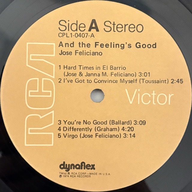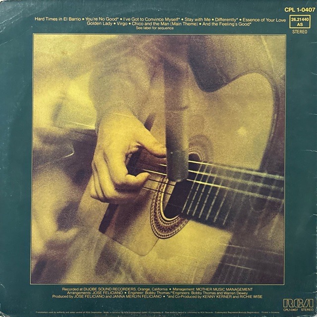 盲目のプエルトリカン・ギタリスト/シンガー、Jose Felicianoの74年リリース屈指の名作アルバム!Stevie Wonderの名曲「Golden Lady」の素晴らしいラテン/フリーソウルカバー、心暖まるメロディが切ないラテンソウルB3「Chico And The Man (Main Theme)」、疾走するグルーヴィーなフォークA1「Hard Times in El Barrio」、Allen Toussaint制作A2ミディアムAOR/ライトメロウ「I've Got to Convince Myself」、Dennis Coffeyばりのロックギターが炸裂するA5「Virgo」など、素晴らしい楽曲を凝縮した人気の1枚!!