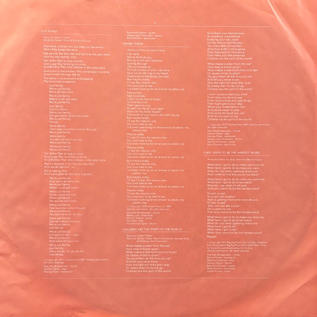 シングルカットもされているソウルフルで素晴らしいヴォーカルが炸裂する開放的な爽快ジャジー・ファンク・ブギーB1「Sweet Rain」、ボッサグルーヴにキュートなヴォーカルを乗せるB3「Night Moves」、ドラムにNdugu Leon Chancelorが参加した爽快なソウルダンサーA1「Just Family」、メロウジャジーなB4「Thank The Day」、