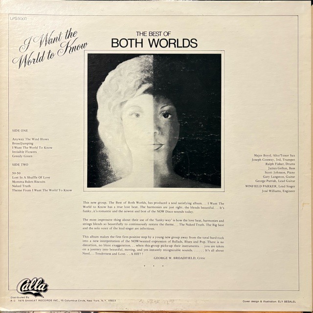 ファンク/ソウル・バンドThe Best Of Both Worldsが75年にCallaレコードからリリースしたこのアルバムは、Winfield Parker(後のモダン・ソウル名曲「I Wanna Be With You」でも知られる)をリードに据え、アレンジにAl Johnsonを迎えた厚みのあるソウル・サウンドが魅力の1枚!