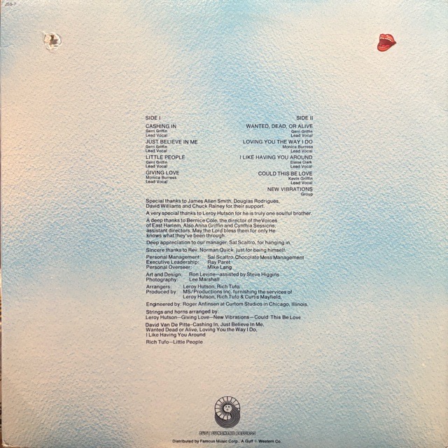 Leroy Hutsonを中心にCurtis Mayfieldやど、シカゴの巨匠がバックアップ!晴れ晴れとした爽快なヤングソウルA1「Cashing In」、グルーヴィーソウルB1「Wanted, Dead or Alive」やB3「I Like Having You Around」、込み上げるコーラスが溌剌としたB5「New Vibrations」、メロウなA4「Giving Love」やフォーキーなB2「Loving You The Way That I Do」など、柔らかく香り高いヤングソウルを満載した名盤!