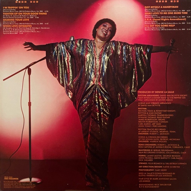 ダンスクラシック「I'm So Hot」で知られるミシシッピ出身の「Blues Queen」ことDenise La SalleがSatisfactionを率いて81年にリリースしたアルバム。貫禄をひしひしと感じる余裕の歌唱を聴かせるミディアムダンサーA1「I'm Trippin' On You」、しっかりとしたダンスグルーヴに流麗なストリングスが漂うA4「When Love Separates」、フリーソウル〜ライトメロウA2「Tighten Up On Your Good Thing」、オールドスクール〜まさかのディスコラップ的なヴォーカルスタイルが飛び出すB3「E.R.A. (Equal Rights Amendment)」、ディスコ/ファンクB4「I'll Get You Some Help」まで、今作もディスコ寄りなトラックを多く収録したナイスアルバムです!