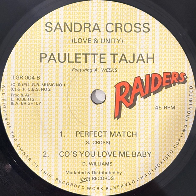 A面はブラス入りのエクステンデッド・リミックス仕様で、後半にインスト・パートが続くロングヴァージョンというDJ泣かせの構成。さらにブラスを省いた別ヴァージョンも収録されており、曲そのものの美しさをじっくり味わえるのもポイントです。B面にはUKラヴァーズ・クイーンSandra Crossによるレア曲「Perfect Match」をカップリング。エレガントなピアノと甘く包み込むようなヴォーカルが印象的な、隠れた名ラヴァーズとして評価の高い一曲。UKラヴァーズの魅力を一枚でしっかり堪能できる、U.K.オリジナル12インチ!