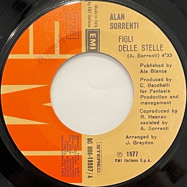 イタリアのシンガー/コンポーザーAlan Sorrentiが77年にリリースした「Figli Delle Stelle」からタイトルをカットしたシングル!J.Graydonがアレンジとギターを担当した「Figli Delle Stelle」は、爽快なAOR〜ブルーアイドソウルの人気曲!7inchはなかなか見ません!
