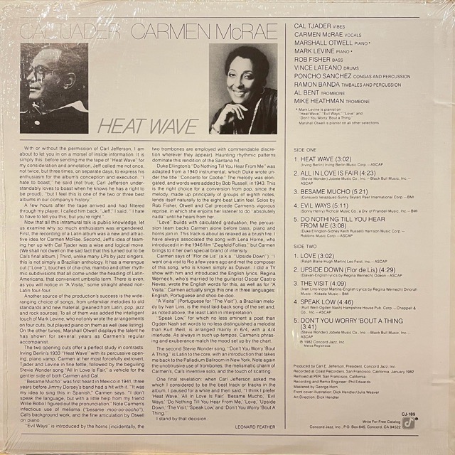 女性ジャズ名ヴォーカリストCarmen McRaeと名ジャズヴィヴラフォン奏者Cal Tjaderの共演盤。
