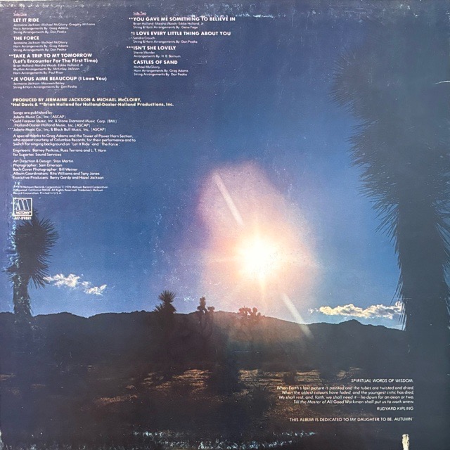 ジャクソンファミリーの三男でJackson5のメンバーJermaine JacksonがMotownより78年にリリースしたアルバム!メロウ名曲「Never Can Say Goodbye」にそっくりなイントロから始まる緩やかなグルーヴA4「Je Vous Aime Beaucoup」、Jay-Z 「Some How Some Way」で使われたトロけそうなメロウ極上曲B4「Castles Of Sand」、うねるベースが強靭なグルーヴを造るミッドテンポなファンクチューンA1「Let It Ride」、カッティングに熱く燃えるディスコファンクA3「Take A Trip To My Tomorrow」など収録!