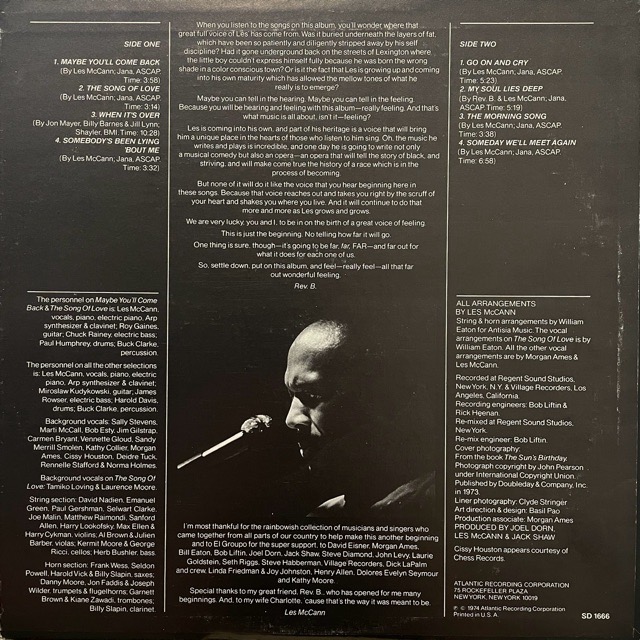 ケンタッキー州レキシントン生まれのジャズ〜ソウル・ピアニスト、そして管楽器やヴォーカルまでこなすミュージシャンLes McCannが74年にリリースしたアルバム。