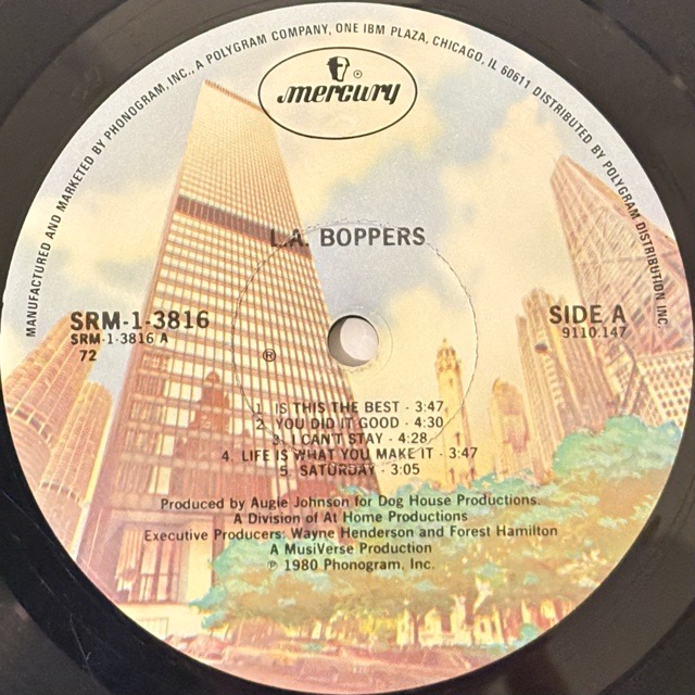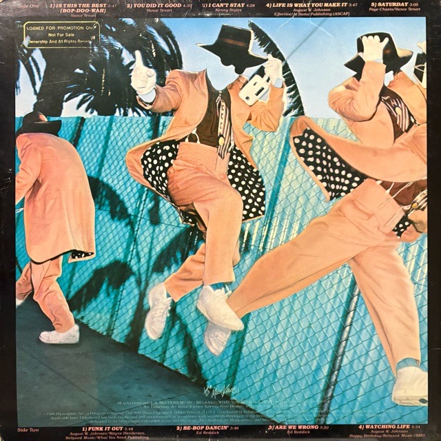 ロスのファンクバンドL.A. Boppersが1980年にリリースしたセカンドアルバム。Side EffectのリーダーAugie Johnsonがプロデュースし、Wayne Hendersonがエグゼクティブプロデュースを担当した本作は、ライトタッチなファンクA1「Is This The Best」から、メロウなA5「Saturday」、B4「Watching Life」まで、心地良いグルーヴと洒落た雰囲気に満ちたナイスアルバムです。