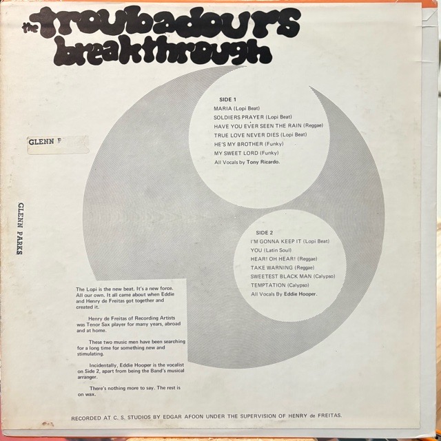 Asquith Clarkeを中心に74年から活動するバルバドスのバンドThe TroubadoursがヴォーカルにTony RicardoとEddie Hooperを迎えて70年に残したレア・アルバム!