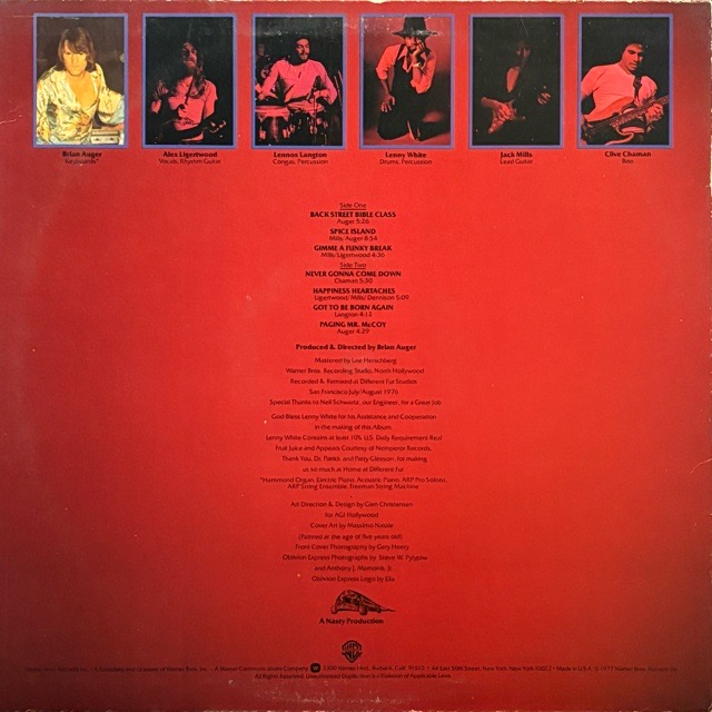 ロンドン出身、60年代からジャズ〜ソウル〜ロックを横断するクロスオーバーなサウンドでシーンを牽引し、Julie Driscollとの活動でも知られる鍵盤奏者が、自身のグループを率いて独自のジャズロックを築き上げたBrian Auger。そんな彼が率いるBrian Auger’s Oblivion Express名義ではラストとなった77年作。