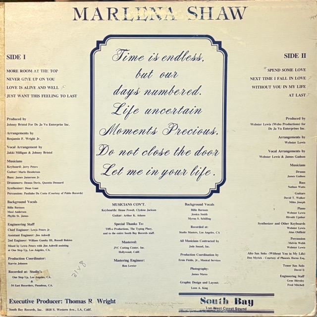 名門Blue Noteに数々の名作を残し2024年に死去した女性シンガーMarlena ShawがJohnny BristolとWebster LewisプロデュースによりマイナーレーベルSouth Bayからリリースした82年作。