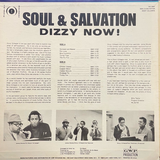 数多くのセッションや作品を残し名ジャズトランペット奏者Dizzy Gillespieが、69年に吹き込んだジャズファンクアルバム!ジャズ史に残る最強のファットなドラムブレイクを刻み込んだジャズファンク最強曲A1「Stomped and Wasted」、ホーンやヴァイブが絡む柔らかいグルーヴが香ばしいA5「The Fly Fox」やミッドテンポジャズB2「Casabah Melon」、哀愁を含んだメロディが素敵なB5「Turkey Fan」等、素晴らしい内容となっています!
