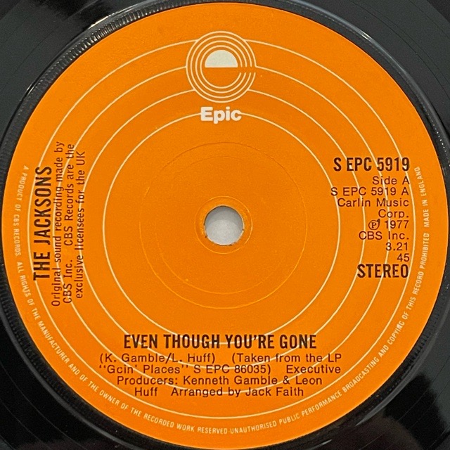 Michael Jacksonが青年期を過ごした兄弟グループThe Jacksonsが、Gamble & HuffやDexter Wansel等フィリーソウルの敏腕プロデューサーのバックアップを受けて77年に放ったアルバム「Goin' Places」から2曲をカットしたシングル。ドラマチックなストリングスが流れるミディアム・ヤングソウル「Even Through You're Gone」、楽しげなMichael Jacksonの面影を思い出さずにはいられないダンストラック「Different Kind Of Lady」ともに素晴らしい!